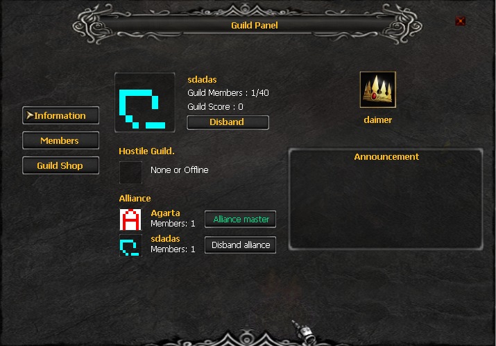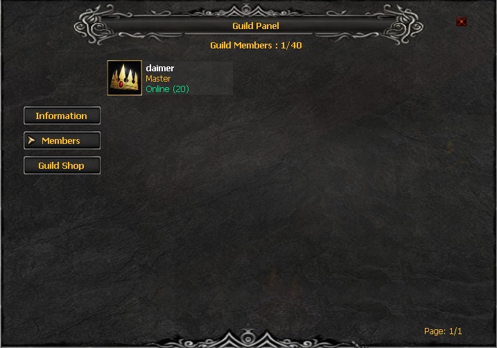 The "Members" tab displays the entire guild. The Guild Master can also change the guild's status to Assistant or Battle Master.